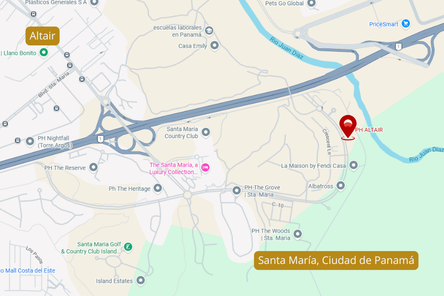 ALTAIR se ubica en Santa María Golf & Country Club, una de las comunidades más exclusivas y mejor planificadas de la ciudad de Panamá. Su ubicación estratégica ofrece acceso directo al Corredor Sur y conexión ágil hacia Costa del Este, el centro financiero y el Aeropuerto Internacional de Tocumen.