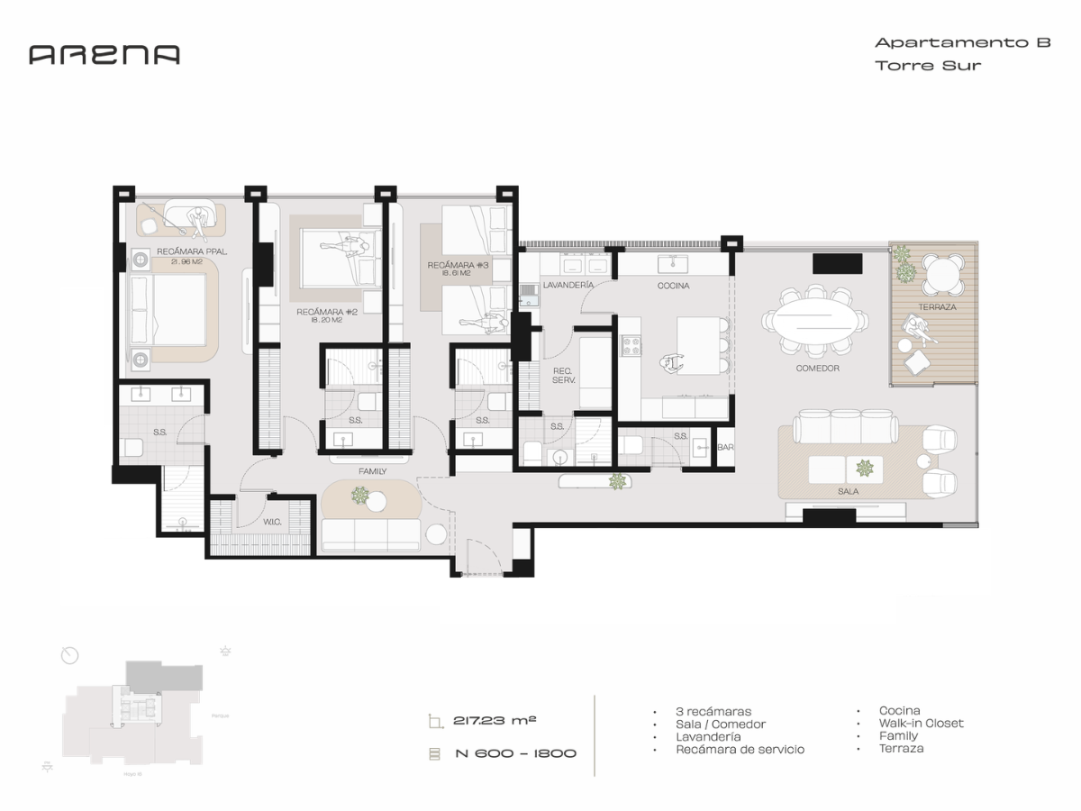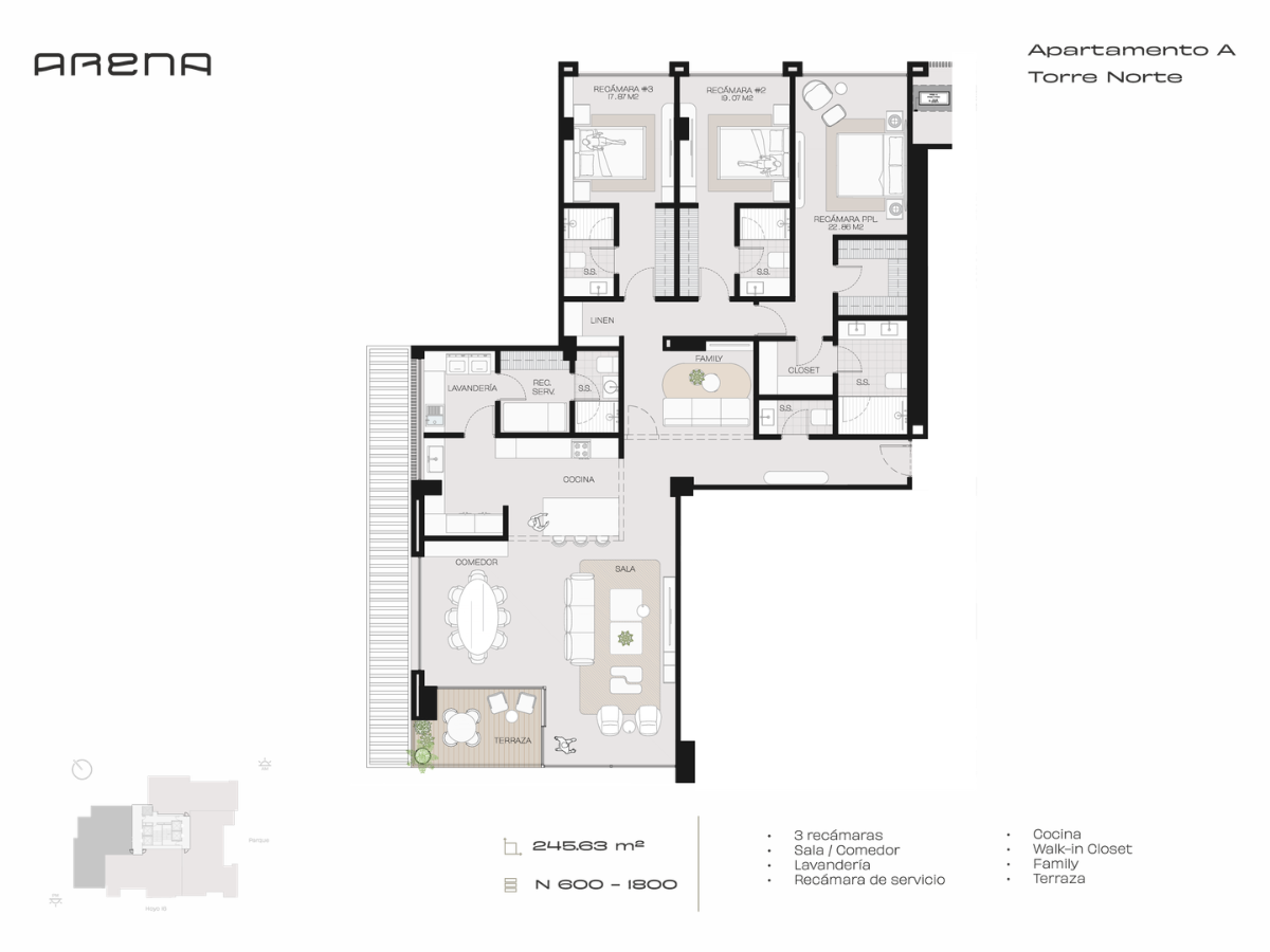 3 recámaras | Sala / Comedor | Lavandería | Recámara de servicio | Cocina | Walk-in Closet | Family | Terraza