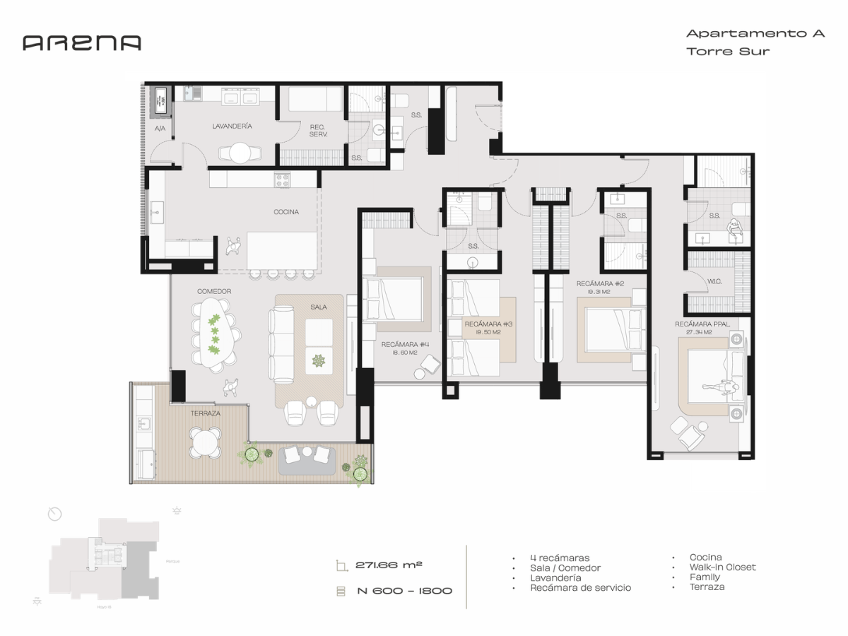 4 recámaras | Sala / Comedor | Lavandería | Recámara de servicio | Cocina | Walk-in Closet | Family | Terraza