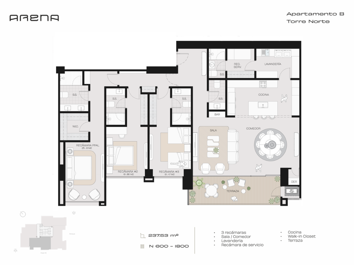 3 recámaras | Sala / Comedor | Lavandería | Recámara de servicio | Cocina | Walk-in Closet | Terraza
