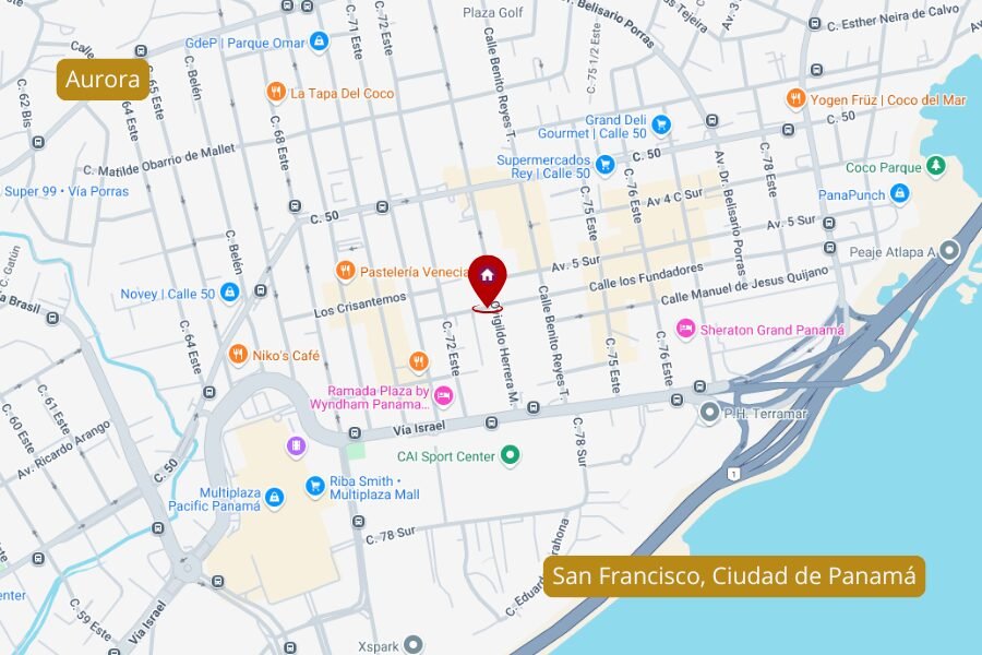 Disfruta de un entorno urbano vibrante, rodeado de servicios, parques y comercios. A solo pasos del Parque Omar, Multiplaza, Riba Smith, Hospital Punta Pacífica, Plaza Atlapa, supermercados como Rey y Super 99, y reconocidos colegios como el Instituto Don Bosco. Accede en minutos al Corredor Sur y al Aeropuerto de Tocumen, manteniéndote siempre conectado con la ciudad y el mundo.