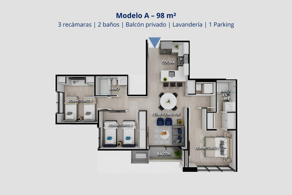Los apartamentos han sido diseñados con una distribución inteligente, acabados de alta calidad y balcones privados que favorecen la ventilación cruzada y la luz natural. Disponibles en modelos de 1, 2 y 3 recámaras, los cuales se adaptan a cada estilo de vida