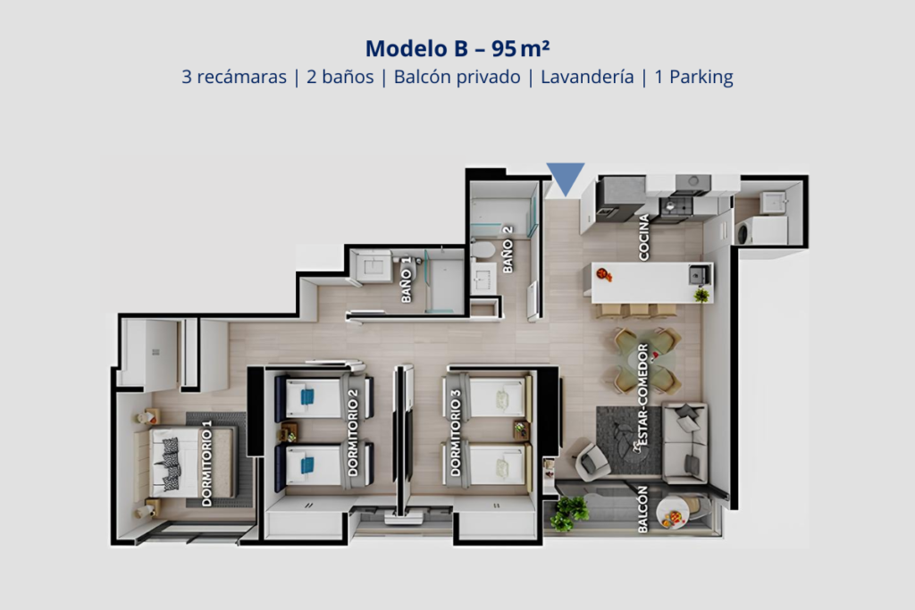 🏢 95 m² – 🛏️ 3 Recámaras – 🛁 2 Baños – 🪟 Balcón – 🅿️1 Parking