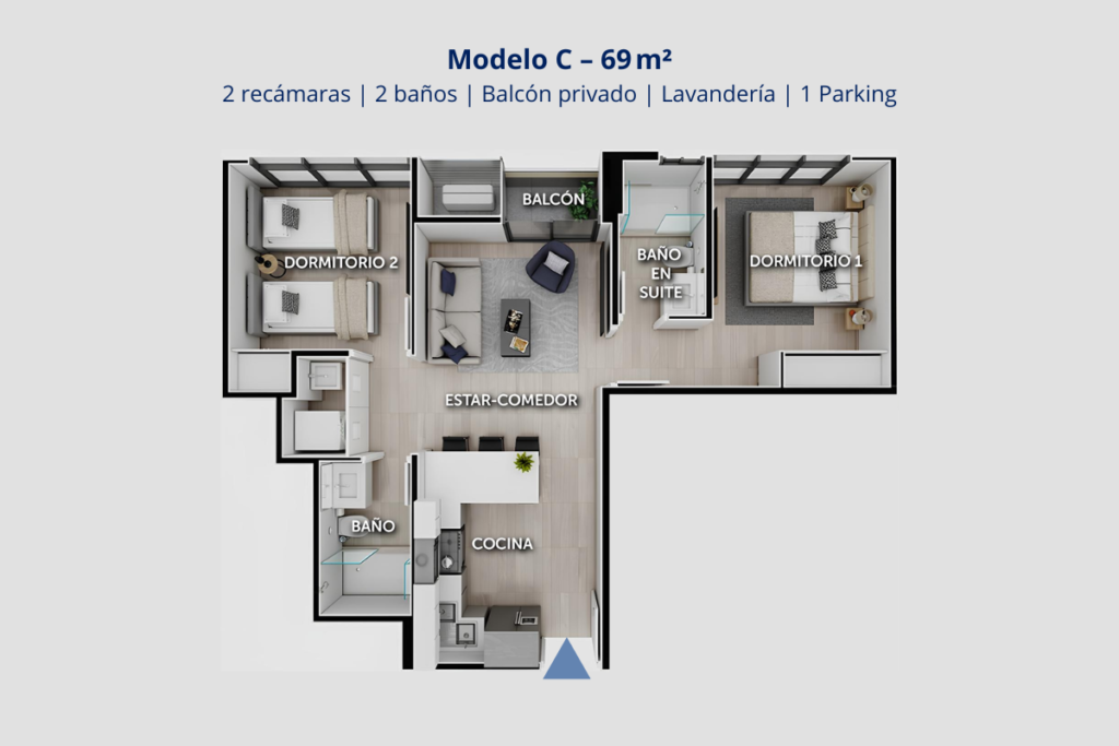 🏢 69 m² – 🛏️ 2 Recámaras – 🛁 2 Baños – 🪟 Balcón – 🅿️ 1 Parking