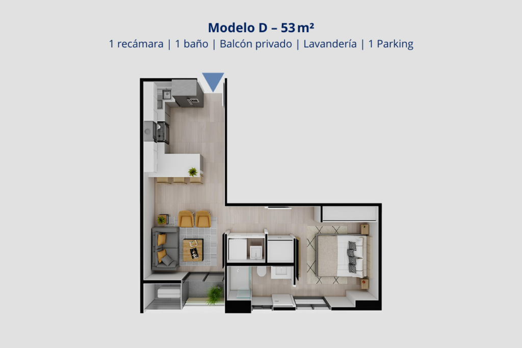 🏢 53 m² – 🛏️ 1 Recámara – 🛁 1 Baño – 🪟 Balcón – 🅿️ 1 Parking