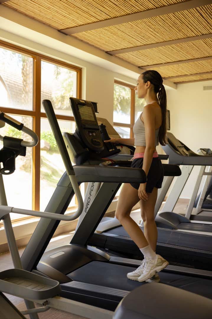 - Gimnasio moderno con máquinas de cardio y pesas para quienes desean mantenerse activos frente al mar.