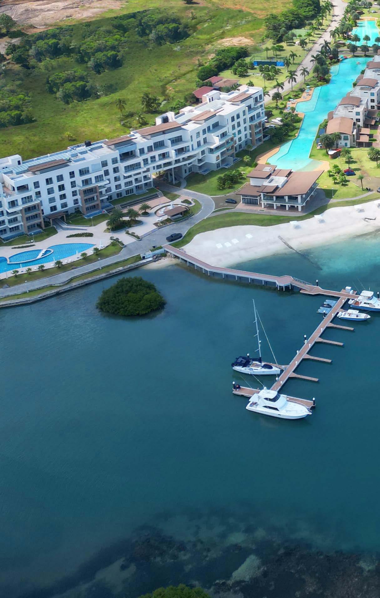 - Clubes frente al mar – Blu Beach Club y Casa Grande – con piscinas, baños, salones de eventos, gimnasio y tiendas (algunos aún en desarrollo).