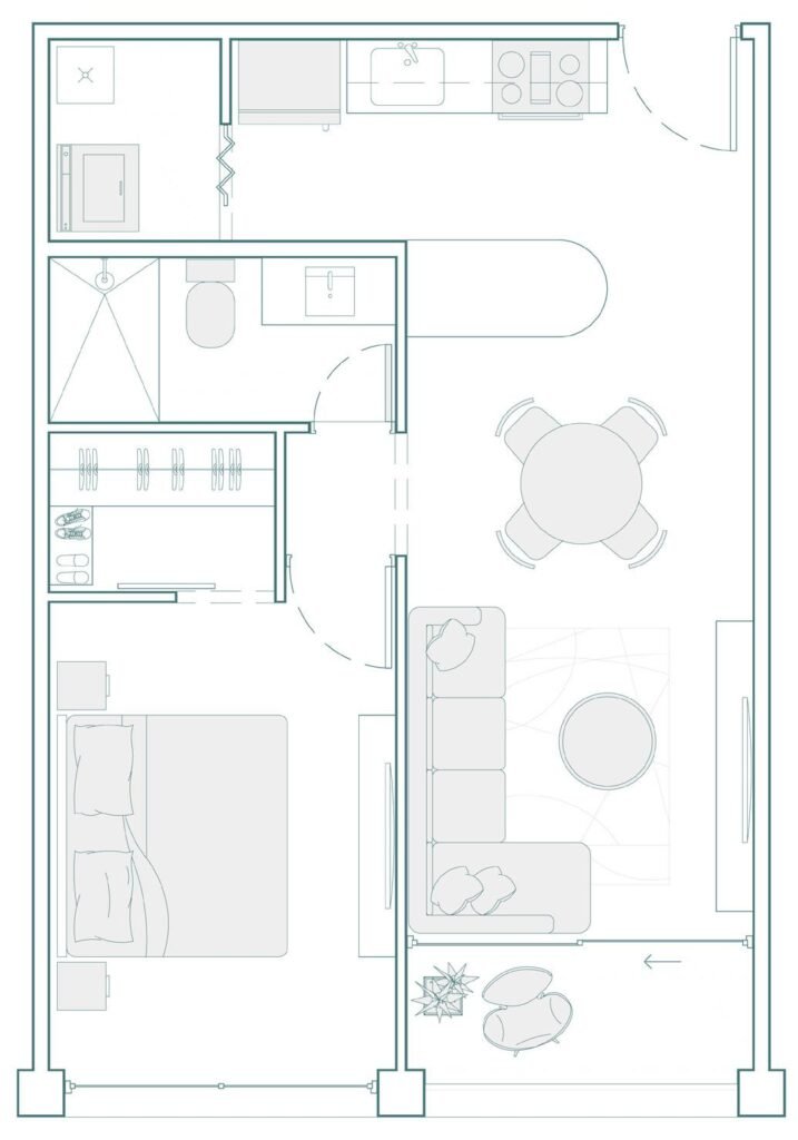 1 Recámara | Walk-in closet | 1 Baño | Balcón | Lavandería | Cocina abierta | 1 Parking