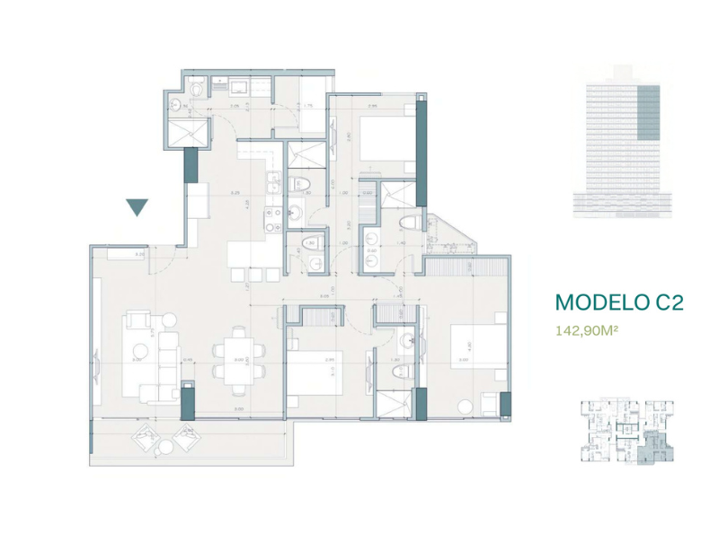 🏢 142 m² – 🛏️ 3 Recámaras – 🛁 3 Baños – 🪟 Balcón, Cuarto y Baño de Servicio – 🅿️ 2 Parking