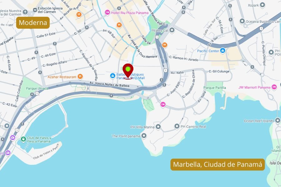 Moderna 360 está estratégicamente ubicado en Marbella, a pasos de destinos clave como Multiplaza, la Cinta Costera, el Hospital Paitilla, el Club de Yates, y centros comerciales exclusivos como Pacific Center, Soho City Center y el JW Marriott. También cuenta con cercanía a hoteles icónicos como el Hilton y el Sheraton Grand Panamá, además de servicios esenciales como Novey Calle 50. Esta conectividad privilegiada lo convierte en la opción ideal para quienes buscan una estadía cómoda, segura y rentable, ya sea por negocios o placer