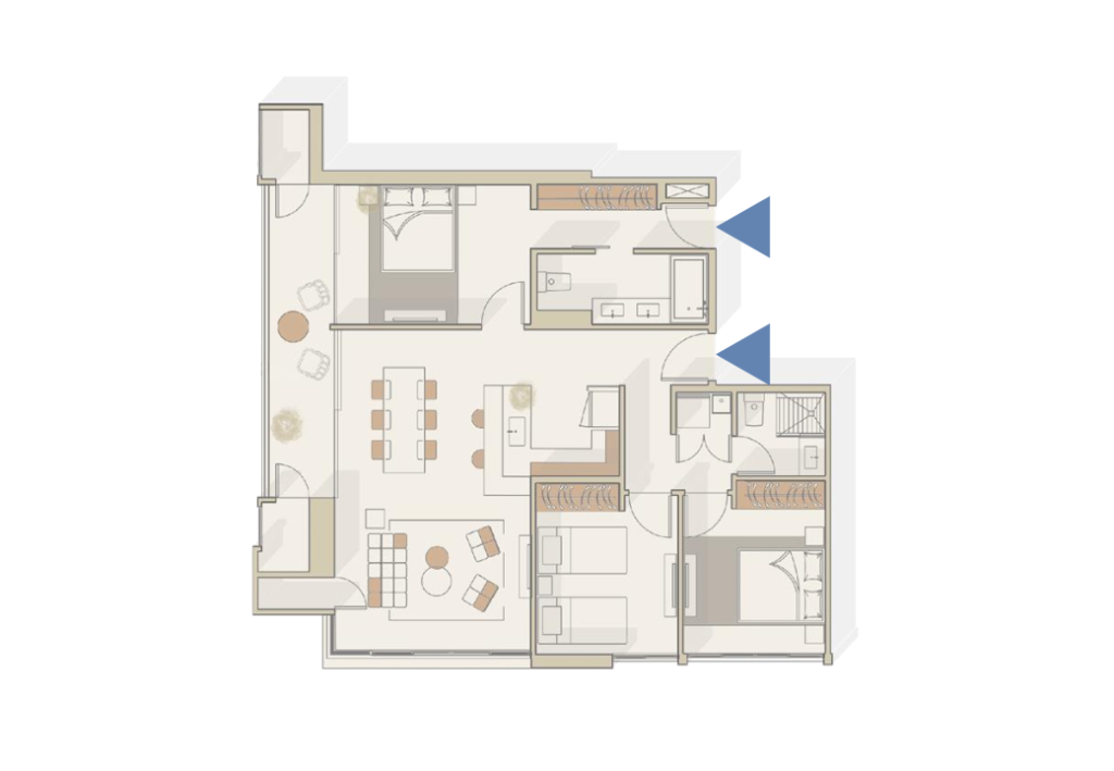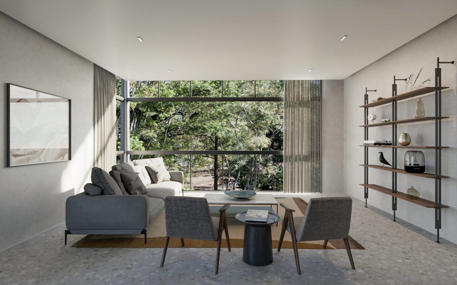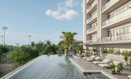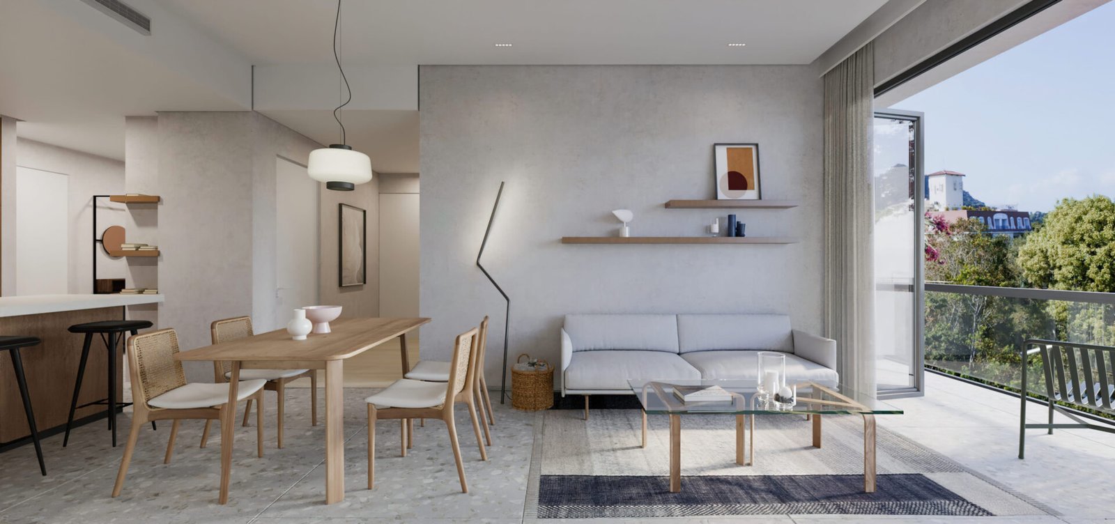 El desarrollo está compuesto por cuatro edificios residenciales, cada uno con lobby privado y áreas sociales propias. Sus apartamentos ofrecen distribuciones de 1 a 3 recámaras, con metrajes aproximados desde 51 m² hasta 146 m², diseñados con cocinas abiertas, balcones privados y espacios familiares que aprovechan la luz natural y las vistas del entorno.