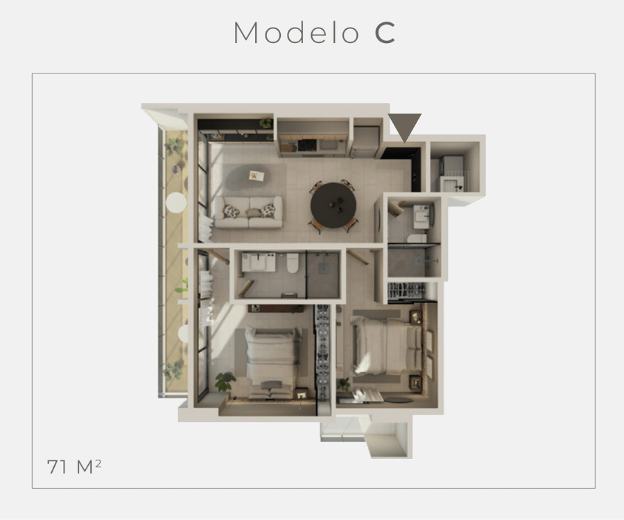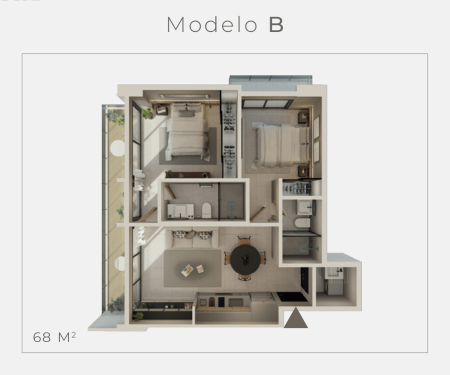 Opciones más amplias en 2 recámaras, perfectas para familias pequeñas o inversionistas que buscan mayor proyección de valor.